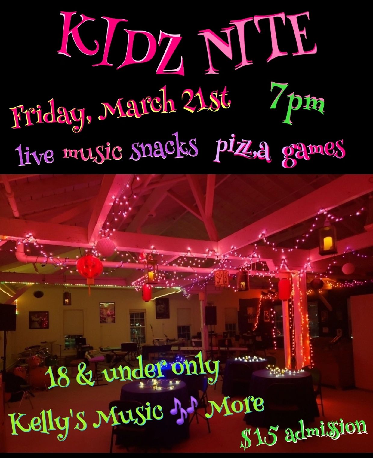KIDZNITE is a get-together for kids to have fun and let loose in a safe environment. Live music, snacks, video games, board games, art, & pizza. Invite friends and other kids in the family! Every kid is welcome to play and sing if they like, or just hang out and enjoy themselves.